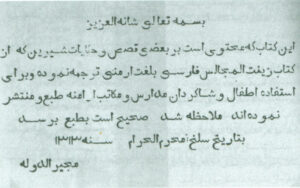 این کتاب که محتوی است بر بعضی قصص و حکایات شیرین که از کتاب زینت المجالس فارسی، به لغت ارمنی ترجمه نموده و برای استفاده اطفال و شاگردان مدارس و مکاتب ارامنه طبع و منتشر نموده اند ملاحظه شد، صحیح است به طبع برسد. به تاریخ سلخ المحرم الحرام سنه ۱۳۱۳.