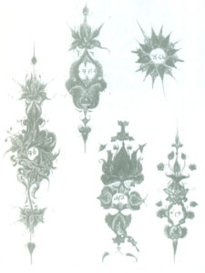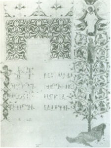 شاهد این گفته ها کتاب خطی متعلق به ۱۲۸۶ میلادی است. در این کتاب که دارای ۴۰۰ صفحه است بالغ بر ۷۰۰ نقش زینتی دیده می شود (در هر صفحه ۱ الی ۳ نقش) که هیچکدام تکراری نیستند. این نقوش اکثراً از موتیف های گیاهی و جانوری تشکیل شدهاند که بصورت نقوش حاشیه ای، نقوش مجزا کنندۀ متون و نقوش پایانی دیده میشوند (تصویر ۳۱ و۳۲).