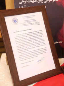 متن تقدیرنامهٔ دانشکدهٔ ایران شناسی دانشگاه ایروان (ارمنستان)