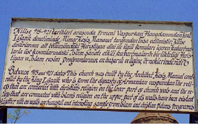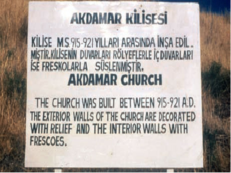 در کنار کلیسای صلیب مقدس، واقع در جزیرۀ آختامار،[۶] در سه دورۀ مختلف تابلوهای راهنما نصب شده است. تابلوی اول که دکتر آرمن حق نظریان[۷] در ۱۹۸۰م، از آن عکس گرفته به دو زبان ترکی و انگلیسی است.
