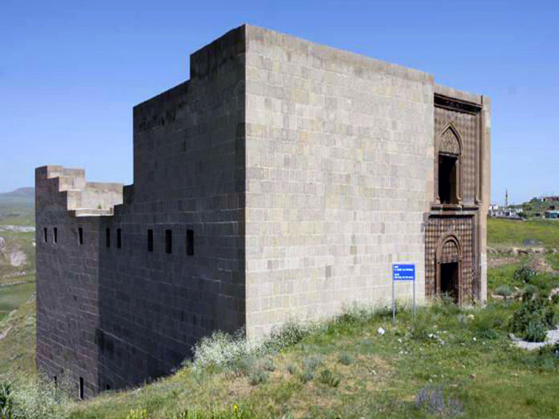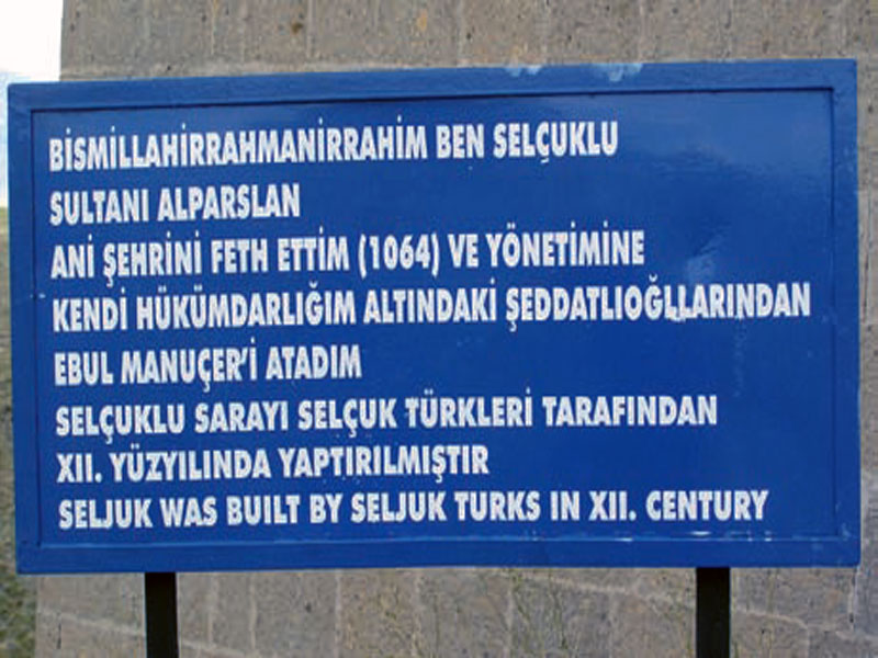 «بسم الله الرحمان الرحیم، من آلب ارسلان، سلطان سلجوقی، در سال ۱۰۶۴م، شهر آنی را تصرف و ابول منوچهر، از خاندان شداد اوقلی، را حاکم شهر تعیین کردم. این قصر سلجوقی در قرن دوازدهم میلادی توسط ترکان سلجوقی بنا شده است».