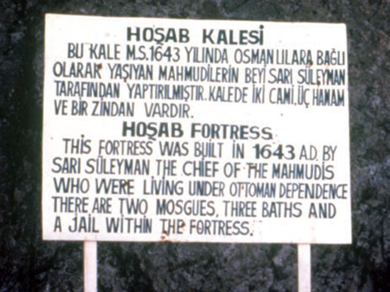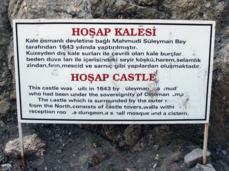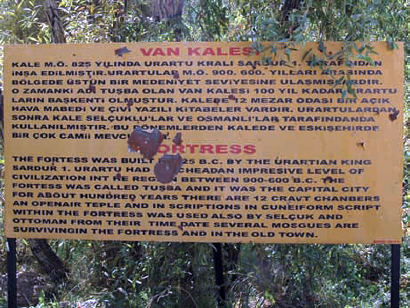 تابلوی راهنمایی به زبان های ترکی و انگلیسی در کنار دروازۀ قلعۀ وان[۱۲۲] نصب شده که در ۲۰۰۶م، از آن عکسبرداری شده است.