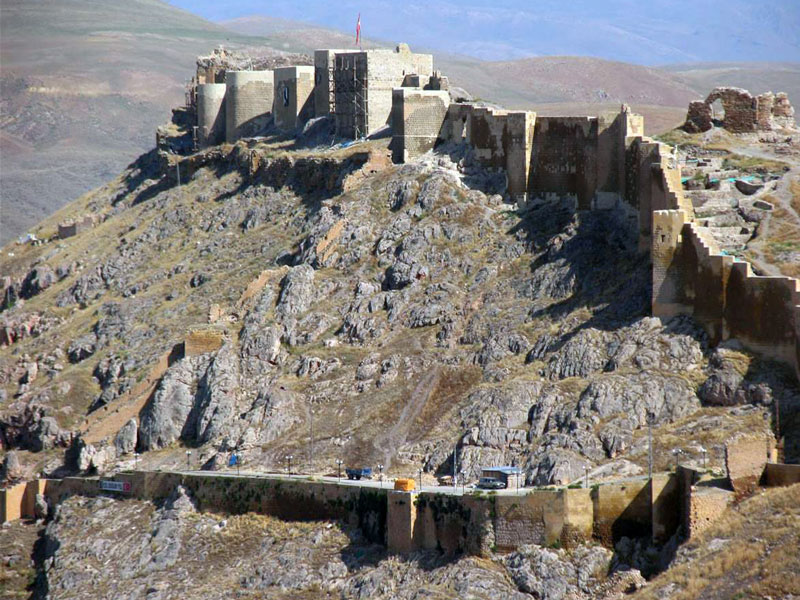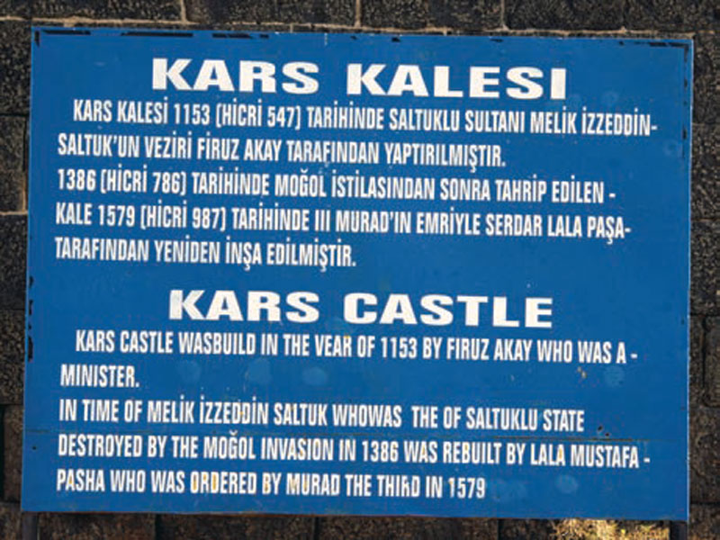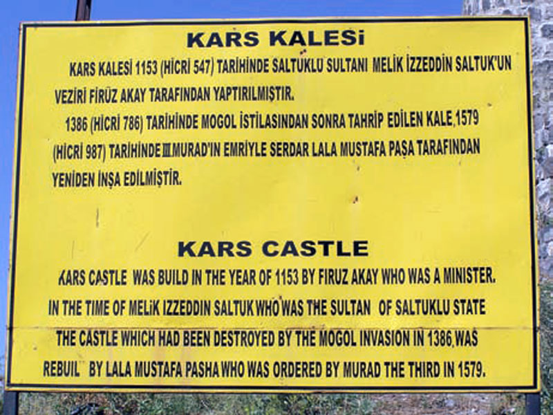 «قلعۀ قارص. قلعه در ۱۱۵۳م (۵۴۷ ق)، به دست فیروزآقا، وزیر ملک عزالدین سلدق، از خاندان بنی سلدق،[۴۱] ساخته شد. قلعه در ۱۳۸۶م (۷۸۶ ق)، بر اثر حملۀ مغول ها ویران و در ۱۵۷۹م (۹۸۷ق)، به دست مصطفی لالا پاشا، سردار سلطان مراد دوم، بازسازی شد».