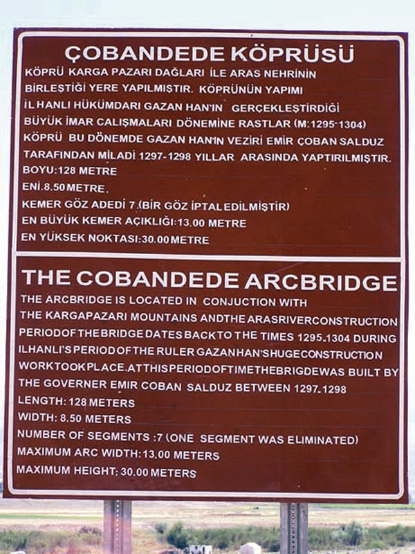 ترجمۀ متن تابلوی راهنما به شرح زیر است: «پل چوپان دِده. پل در محل پیوستن کوه های کارکابازار به رود ارس ساخته شده است. تاریخ بنـای پـل به دورۀ خانـدان ایلخـان ها در زمــان سازنـدگـی غـازان خــان (۱۲۹۵ـ۱۳۰۴م) بـاز مـی گردد. پـل توسط امیـر چـوپان سالـدوز، وزیـر غـازان خـان، در سـال هــای ۱۲۹۷ـ ۱۲۹۸م ساخته شده است. طول پل ۱۲۸متر و عرض آن ۵/۸ متر، تعداد چشمه ها هفت عدد، طول بزرگ ترین چشمه سیزده متر و مرتفع ترین نقطۀ پل سی متر است».
