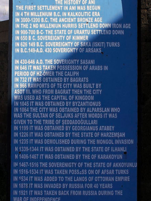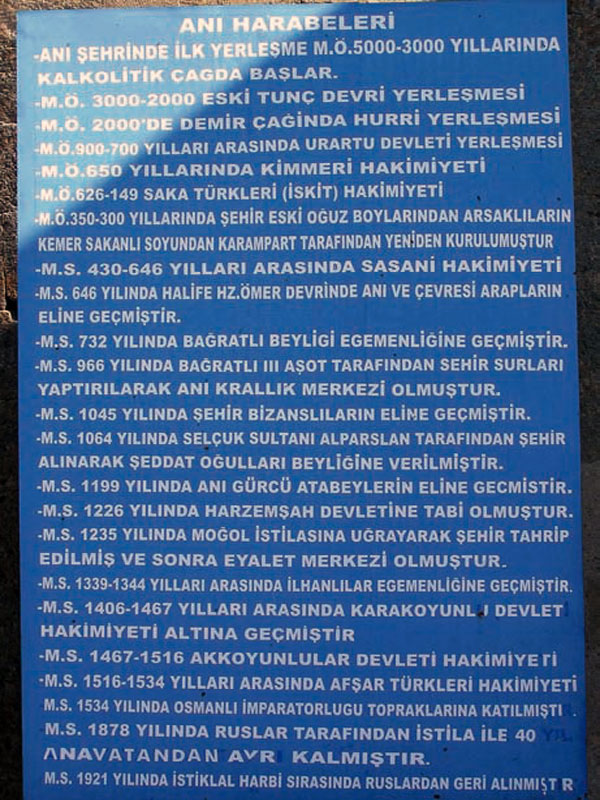 «ویرانه های شهر آنی. سکونت در آنی از ۵۰۰۰ ـ ۳۰۰۰ ق. م. در دوران نوسنگی آغاز شده است. از ۳۰۰۰ ـ ۲۰۰۰ ق. م.، در دوران عصر برنز، نیز سکونتگاه انسان بوده است [در متن انگلیسی به جای ۲۰۰۰ عدد ۱۲۰۰ نوشته شده است]. از ۲۰۰۰ ق .م. سکونتگاه اقوام هوری شده است. از ۹۰۰ ـ ۷۰۰ ق. م. سکونتگاه اورارتو بوده است. از ۶۵۰ ق .م. تحت کنترل هخامنشیان قرار گرفته است. از ۶۲۶ ـ ۱۴۹ق .م. تحت کنترل اقوام ترک سکاها (سیت ها) بوده است. از ۳۵۰ ـ ۳۰۰ق. م. شهر توسط کرمپارتی، از خاندان کامساراکان های آرشاکونیاتس،[۷۴] که از اقوام اوغوز بودند، بازسازی شده است [در متن انگلیسی آمده است که از ۱۴۹ق. م. الی ۴۳۰م، این مکان تحت کنترل خاندان آرشاکونیاتس بوده است]. از ۴۳۰ ـ ۶۴۶م، تحت حاکمیت ساسانیان قرار داشته است. از ۶۴۶م، در زمان خلافت عمر، تحت حاکمیت اعراب قرار گرفت. خاندان باگرادونی از ۷۳۲م حاکمان شهر شدند. در ۹۶۶م، آشوت دوم باگرادونی دیوارهای شهر را بازسازی می کند و آنی پایتخت پادشاهی وی می شود. در ۱۰۴۵م، شهر به دست بیزانس می افتد. در ۱۰۶۴م، شهر به تصرف آلب ارسلان، سلطان سلجوقیان، درمی آید و او هم آن را به خاندان شداد اوقلی می دهد. در ۱۱۹۹م، شهر به دست اشراف گرجی می افتد. در ۱۲۲۶م، خوارزمشاهیان شهر را تصرف می کنند. مغول ها در ۱۲۳۵م، شهر را تصرف و ویران می کنند و پس از مدتی مرکز اداری منطقه می شود. از ۱۳۳۹ ـ ۱۳۴۴م، تحت کنترل ایلخانیان در می آید. از سال ۱۴۰۶ ـ ۱۴۶۷م، به دست قره قویونلوها می افتد اما از ۱۴۶۷ ـ ۱۵۱۶م، به تصرف آق قویونلوها در می آید. از ۱۵۱۶ ـ ۱۵۳۴م، به تصرف ترک های افشاری درمی آید. در ۱۵۳۴م، ضمیمۀ امپراتوری عثمانی می شود. در ۱۸۷۸م، به تصرف روسیه درمی آید و برای مدت چهل سال از وطن جدا می ماند. در ۱۹۲۱م، در زمان جنگ های استقلال، از روسیه پس گرفته می شود».