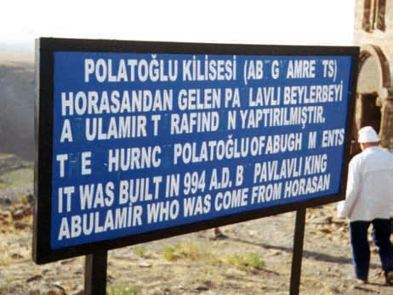 در ۱۹۹۰م، زاون سرکیسیان از تابلوی راهنمای کنار کلیسای ابوقامرنتس[۱۳۰] در شهر آنی، که توضیحاتی به زبان های ترکی و انگلیسی در آن نوشته شده، عکسی تهیه کرده است.