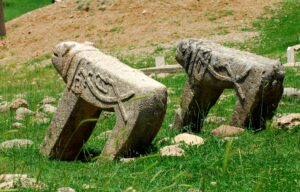تزیینات سرپوش، تنپوش و رخت و پوششهای دیگر با این نقش و نگارها وجود دارد. (۳۸) مثلاً اسب نمادی از خورشید بود که گردونة او را میکشید و در هنر تدفینی نماد مرگ است. (۳۹) در بختیاری بیش از ۴۰ نگاره روی پیکرة شیرهای سنگی و مزار زنان و مردان میگذارند. (۴۰) همین نگارهها در قوچ و اسب سنگی هم با تفاوتهایی وجود دارد. (۴۱)