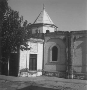 استاد دبیرسیاقی، زیر عنوان کلیسای ارامنهٔ قزوین، آورده است: ‹‹این کلیسا در داخل مدرسهٔ ارامنه در ضلع شمالی خیابان شاه [طالقانی کنونی] مابین سبزه میدان و چهارراه خیام واقع است و تاریخ بنای مدرسه و کلیسا بر اساس لوحهٔ سنگی که بر سردر مدرسه نصب شده است ۱۲۸۷ شمسی است».[۳۸]