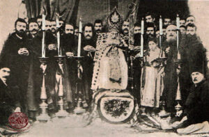 ۶۸- فرد نشسته بر روی تخت در وسط عکس اسقف متوفاست که نشان میدهد جنازه چطور در داخل دخمه دفن شده (منبع تصویر: آرشیو گریگور گالستیان، نیویورک).