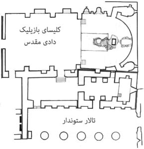 در کف کلیسای دادی مقدس، آثار دیوارهایی یافت شد که به کلیسای بازیلیک کوچک ختم میشود و بیانگر آن است که در اطراف دخمه قبر بنایی وجود داشته که با کلیسای بازیلیک کوچک مرتبط بوده. پس از ساخته شدن کلیسای بازیلیک دادی مقدس (تصویر۸ ـ شماره ۷) و صحن کلیسای بازیلیک کوچک در غرب آن (تصویر۸ ـ شماره ۸) بقایای این بنا محو شده است.