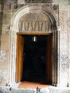 کلیسا دو ورودی دارد: یکی در ضلع غربی، که به داخل تالار ستوندار باز می شود و دیگری در ضلع شمالی، که طی مرمتهای دورههای بعد بسته شده است. هر دو ورودی دارای تزیینات و کتیبه است.
