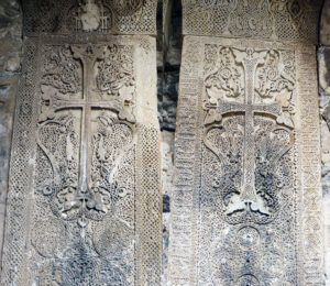 این دو خاچـکار، که دارای یک سبـک هستند و همزمان تراشیده شـدهاند، از خاچکارهای منحـصر بهفرد در کل فلات ارمنستان محـسوب میشوند. حجـاری آنها شامـل سه لایه است که استادی توانا آن را تراشیده. متأسفانه، نام استاد سنگتراش بر روی آنها ذکر نشده و درباره خالق آنها اختلافنظر وجود دارد. گروهی آنها را اثر دست بوقوس میدانند که خاچکارهای بسیار زیبایی از او در گوشاوانک برجای مانده. عقیده دیگر این است که استاد سنگتراش در خلق نقشهای این خاچکارها تحتتأثیـر کارهای سوزندوزی آرزوخاتون بوده است. هر دو خاچـکار دارای کتیبه با حروف برجستـه هستند. بر روی قرنیـز خاچکار سمـت چپی تصویر حضرت مسیـح و در بالا و لبه قرنیـز جملهای به یادبـود اسقف حجـاری شده.(۱۱۲) در کتیبـه واقـع در حاشیـه چهار طرف خاچـکار سمت راست، اسقف آتانـِس ضمـن معرفی خود ارتباطش با خاندان واختانگیان و تاریـخ برپـایی خاچـکار را بیـان میکند .(۱۱۳)