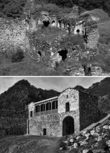 همزمان با مرمت، بررسیهای باستانشناسی نیز صورت میگرفت. جستوجوهای باستانشناسی برای یافتن بافتهای متعلق به سده نهم میلادی در ۲۰۰۸م انجام شد. نتایج جالبی از این کاوشها به دست آمد که طی این مقاله به آنها خواهیم پرداخت.بر اساس برنامه تنظیم شده، بنیاد مطالعات معماری ارمنیان(۶۲) مرمت دیر را آغاز کرد. بازسازی تا آغاز جنگ آرتساخ و آذربایجان در سپتامبر۲۰۲۰م بدون وقفه ادامه یافت. مرمت بناهای جانبی، دیوارهای خارجی و ساختمانهای خارج از محوطه دیر، که در ارتباط با دیر هستند، تمام نشده اما به دلیل وضعیت کنونی متوقف شده. دکتر آرمن حق نظریان، بنیانگذار و مسئول بنیاد مطالعات معماری ارمنیان، از ۱۹۹۹م تا هنگام درگذشتش، در سال ۲۰۰۹م با جلب حمایت خیران توانست هزینه مرمتهای صورت گرفته در این دوره را تقبل کند(۶۳) اما از ۲۰۰۹م دولت آرتساخ هزینههای مرمت را پرداخت کرد.