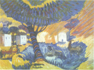 ساریان با دید نافذ خود، توانای آن را دارد که قدرت و رسایی درک خود را به فرم ها بدهد و با فرم ها بنیان و هماهنگی و ترکیب هایش را به تصویر در آورد. اگر می بینید که او اهمیت کمتری به سوژه ای می دهد یا دست کم جزییات و هنر تصویری را کمتر به نمایش در می آورد، خواهید دید که ساختار تصویری ساریان تقریباً زینتی و تزینیی است. او در جستجوی هماهنگی برای چیزیهایی است که وجود دارند، برای خشنودی و رضایت خاطری است که آن ها با نگاه می توانند فراهم کنند هم چنان که برای روان… برای دلیل، این درخت تناور را داری که چون خورشیدی بیکران در فضایی پر از سبزه و گیاه آبی رنگ و اخرایی رنگ با زمینه ای زرد، شکوفا شده است. این درخت تناور، نه تنها منظره را نابود نمی کند بلکه چشم اندازی بهشتی به آن می بخشد.