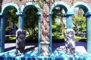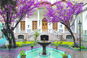 استاد مقدم در ضلع شمالی ساختمان برج ایوانی را بر پایه چند ستون و طاق ساخته. این ایوان با کاشیهای دوران زندیه و قاجار مزین شده است. در وسط این ایوان، حوضچه مرمری کوچکی متعلق به حمام فتحعلی شاه کار گذاشته شده که آب از آن فوران میکند و از طریق یک جوی باریک به داخل استخر میریزد. این استخر، که در حاشیه شمالی حیاط بیرونی واقع شده است، در ۱۳۳۵ش در سفر آن دو به اسپانیا، از روی استخر و آبنماهای مجموعه باغ و اقامتگاه سلطنتی الحمرا (بنایی از دوران اولیه اسلام درناحیه اندلس اسپانیا) الگوبرداری و با استفاده از حوض یاد شده و تعدادی فواره قدیمی اجرا شد.