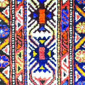کـرم، کـرم تیـره، عاجـی، صـورتـی، لاکـی تـیره، آبـی روشـن، دارچینـی، قـهوهای، سبز روشـن.حاشیـه اصلـی پهـنتر اسـت و حاشیه دیگری با طرح بته به حالت قهر و آشتی یعنی دو به دو بافته شده و درمیان چند حاشیه فرعی قرار گرفتـه است.