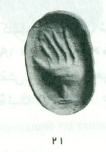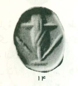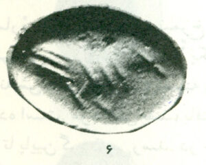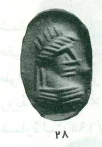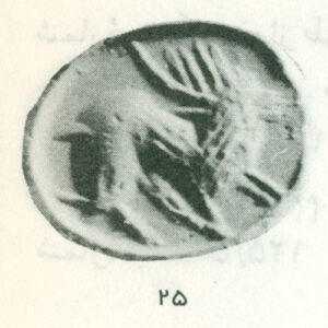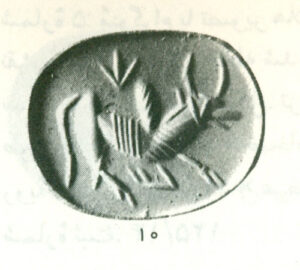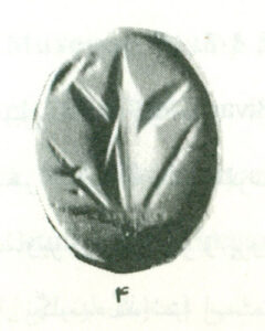 یک انگشتر خاتمدار با فرورفتگی به شکل نیمدایره در بالا و سطح صاف و صیقلی که روی آن عقربی نقش شده است نیز جالب توجه است. در قسمت 8h رویۀ آن نشانهئی وجود دارد که به حرف الف زبان آرامی شباهت دارد (،) [۱۲].