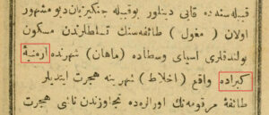 در کتاب تاریخی دیگری به نام مرآت تاریخ عثمانی (آیینۀ تاریخ عثمانی)، چاپ ۱۲۹۳ق/۱۸۷۶م، در مورد خاستگاه اولیۀ جد بزرگ سلاطین عثمانی (قایی خان) [۳۲] به شهر اخلاط (آخلات) واقع در ارمنستان کبرا[۳۳] اشاره شده است (تصویر ۱۵).
