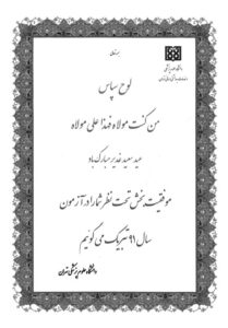 ـ دریافت لوح تقدیر برای کسب رتبۀ نخست بخش قلب از طرف دانشگاه علوم پزشکی تهران، ۱۳۹۱ش