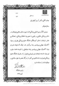 ـ دریافت تقدیرنامه از سوی مسئولان بلندپایۀ دانشگاه علوم پزشکی تهران به مناسبت کسب افتخار برای دانشگاه علوم پزشکی تهران در مقام عضو هیئت علمی این دانشگاه در مقاطع زمانی گوناگون