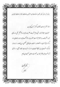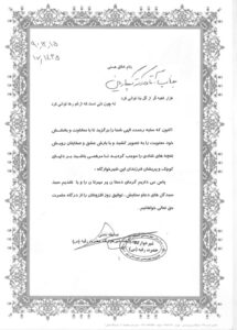 ـ دریافت تقدیرنامه در دوران خدمت نظام وظیفه به منزلۀ پزشک متعهد درمانگاه نمونۀ روستایی در ۱۳۵۵و۱۳۵۷ش