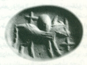 این نقوش معنای نمادین دارند و علاوه بر نشانۀ ایزدان ایرانی و ارمنی برخی به ادوار گذشته و اساطیری ایران قدیم مربوط میگردند. زیرا هَُنر ساسانی خود ترکیبی است از هنر ایران باستان که بعضی از عناصر آن قدمتی سه هزار ساله دارد. در این نقوش کاو مظهر آناهیتا، شیر مظهر میترا، قوچ نشانۀ فره[۲] ایزدی، شاهین نشانۀ ورثرغن و خروس نشانۀ ایزد سروش است. در یکی از این مُهرها تصویر حیوان شاخداری را میبینیم که در هنر ایران و کشورهای همسایه پیشینهئی دیرین و کهن دارد. بر مُهر دیگری نقش گاو کوهانداری با ترکیبی بدیع به تصویر کشیده شده که بر پشت و در مقابلش دو ستارۀ چهارپر دیده میشود. به احتمال زیاد این مُهر در ارمنستان و توسط یک هنرمند محلی خلق گردیده است. در این تصویر هنرمند با ظرافت خاصی ستارهها را به شکل صلیب مجسم کرده اما برای ایجاد تعادل و نظم و القاء تصویر ستاره و صلیب آن را بصورت صلیبهای قبل از دوران مسیحیت و با طول و عرض مساوی به تصویر کشیده است. این نوع صلیب علامت گردش خورشید تصور میشد و در میان مهرپرستان رایج بود (تصویر شمارۀ ۱).