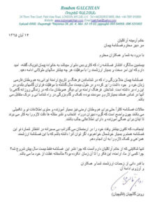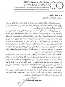 بهرحال از فصلنامۀ پیمان که در مورد اسکان ارامنه در شهرهای مختلف ایران تحقیق کرده و مقالات مفصل و متعددی اینجانب در فصلنامه مذکور خواندهام خواستارم در این مورد تحقیقی بعمل آورده و مطلبی ارائه دهند یا در غیر اینصورت اینجانب را در جریان منابعی بگذارند که بتوانم در این زمینه تحقیق نموده و الف البته نتیجۀ تحقیق را نیز در اختیار فصلنامه خواهم گذاشت.