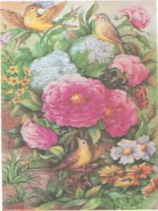 آواز رنگ و نور از قاب هایش بیرون می ترواد. در تابلوی گل و مرغی که از بین کارهایش گزینش کرده ایم وجود رنگ برجسته و چشم گیر گل میانی تابلو نقشی خاص دارد. هر چقدر هم در زوایای نقاشی سیر کنید، به هر حال این گل و رنگ آتشین اش، چشم را به درون می کشد و انگار که از پیچ در پیچ گلبرگ ها شما را به عمق وجود خود و تفکر در زیبایی خلقت اش فرا می خواند. سه پرنده ای که به این ضیافت آمده اند، شاید ساکن و ساکت به نظر آیند، چرا که به هر حال تصویر اند و نقش بسته بر صفحه بوم. لیکن وجود پروانه های نقاشی و به خصوص پروانه ای که در منقار مرغک بالایی است، و نگاه خیره آن دو پرنده دیگر به این یک، که شکاری را صید کرده، تو گویی به یک باره به پرده جان می دهد، تحرک طبیعت را باز می نمایاند و شما را نیز میهمان این بوستان می کند.