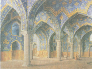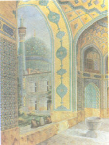 در خصوص دو تابلوی ورودی مسجد جامع و ورودی مدرسه چهارباغ بارها از خود پرسیده ام، که چرا نقاش با وجود آگاهی از زیبایی وکمال معماری این دواثر تاریخی سترگ، به تصویر گری ورودی آن ها پرداخته است. پاسخ را در همین رفتن انسان و تکاپوی او برای شدن و کمال، یافته ام. ورود به مسجد یا عبادتگاه، گام اول عبادت و ورود به مدرسه، گام اول علم آموزی است. گام های اول را باید برداشت، ولی آن چه می ماند تلاش و ادامه کار و یا همان رفتن و طلبیدن – و البته فراخوانده شدن – است.